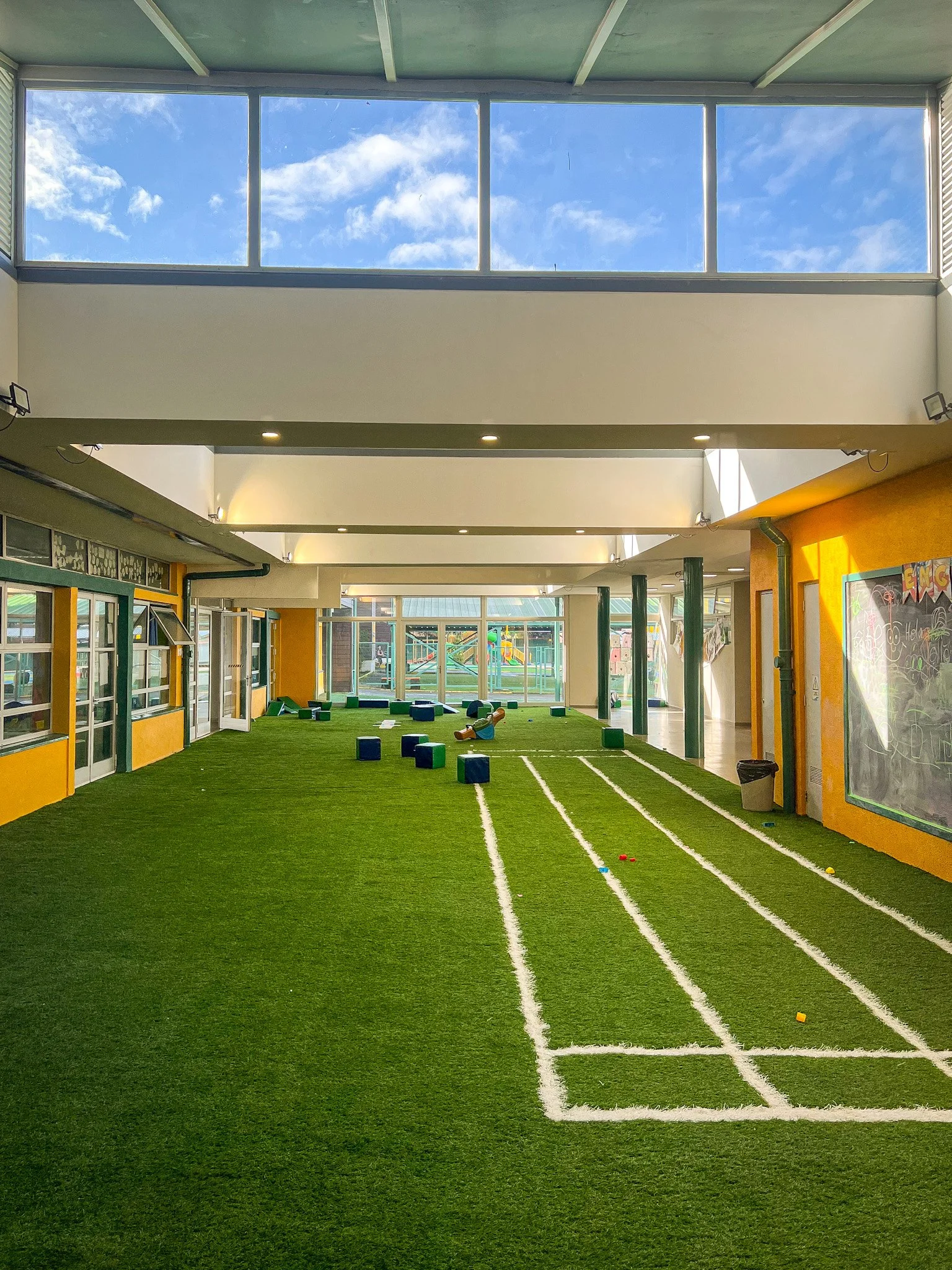La intervención de todo el recinto educacional de Puerto Montt se ha realizado en distintas etapas. Una de sus características es la envolvente, que trabajamos con los colores, para que se reflejara en la iluminación. Por ejemplo, aumentamos el contraste entre los tonos, para que fuese más vibrante el efecto y diera más luminosidad a los espacios. Además, por temas climáticos, tuvimos que hacer simulaciones del comportamiento térmico para optimizar la envolvente.